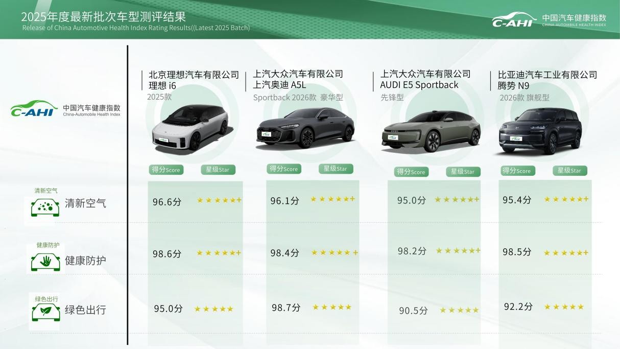 本次发布的C-AHI中国汽车健康指数最新批次测评结果涵盖了理想i6、上汽奥迪A5L、AUDI E5 Sportback、腾势N9四款车型,发布了清新空气、健康防护、绿色出行三个分指数的测评结果。